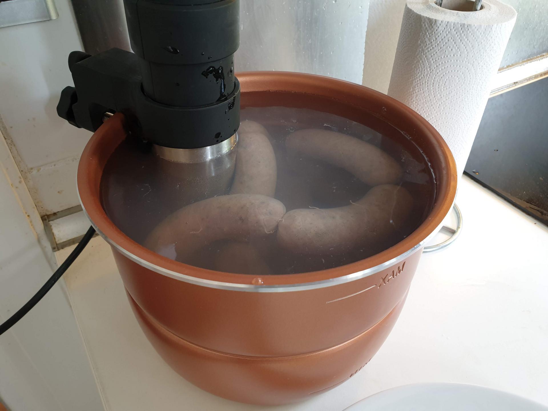 Når pølserne er drejet, blancheres de i 70°C varmt vand i 15 minutter...