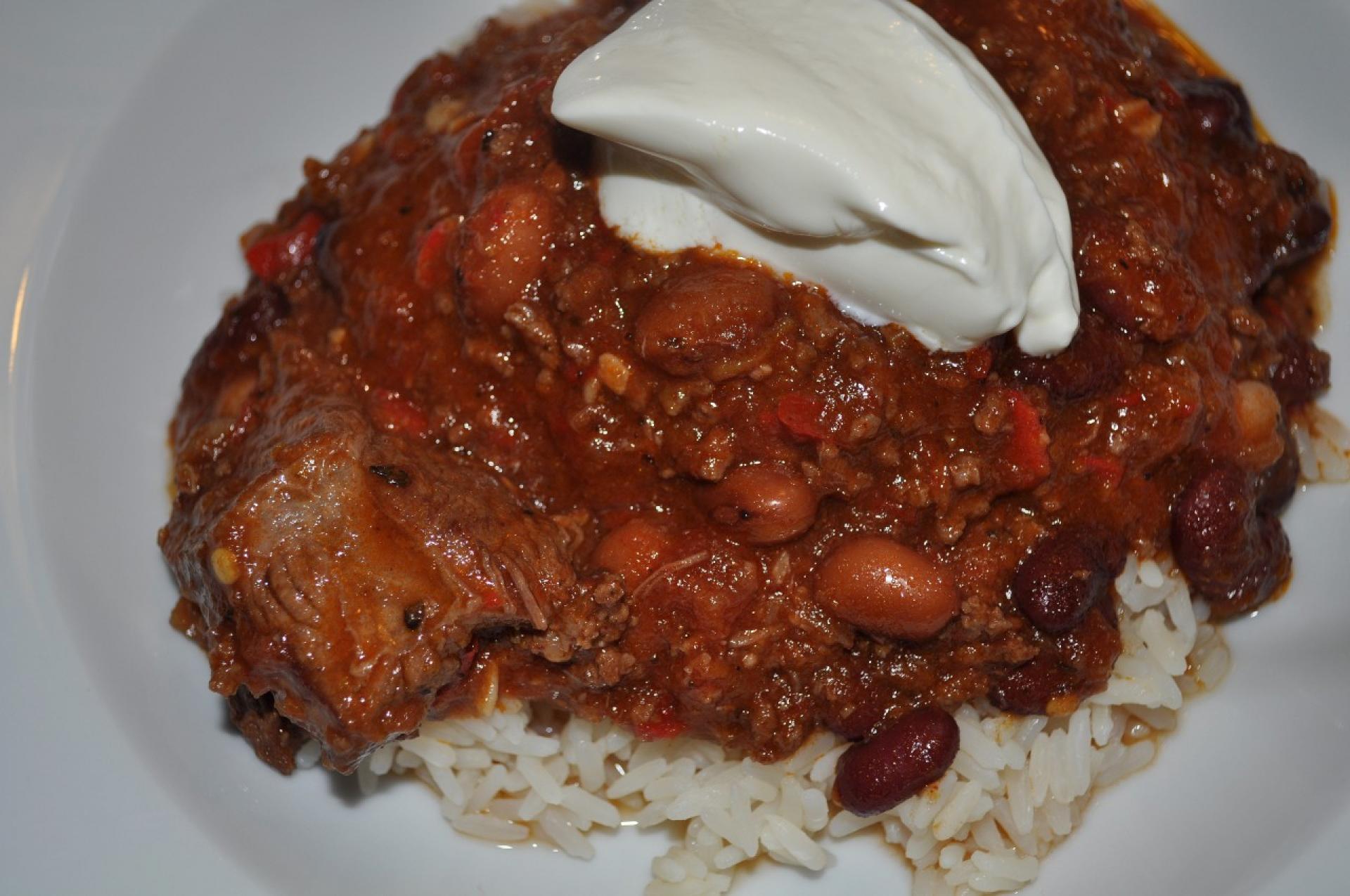 Tilsæt kødet, rødvin, hakket tomat, bouillon, krydderier og chili og lad det simre omkring 3 timer.
