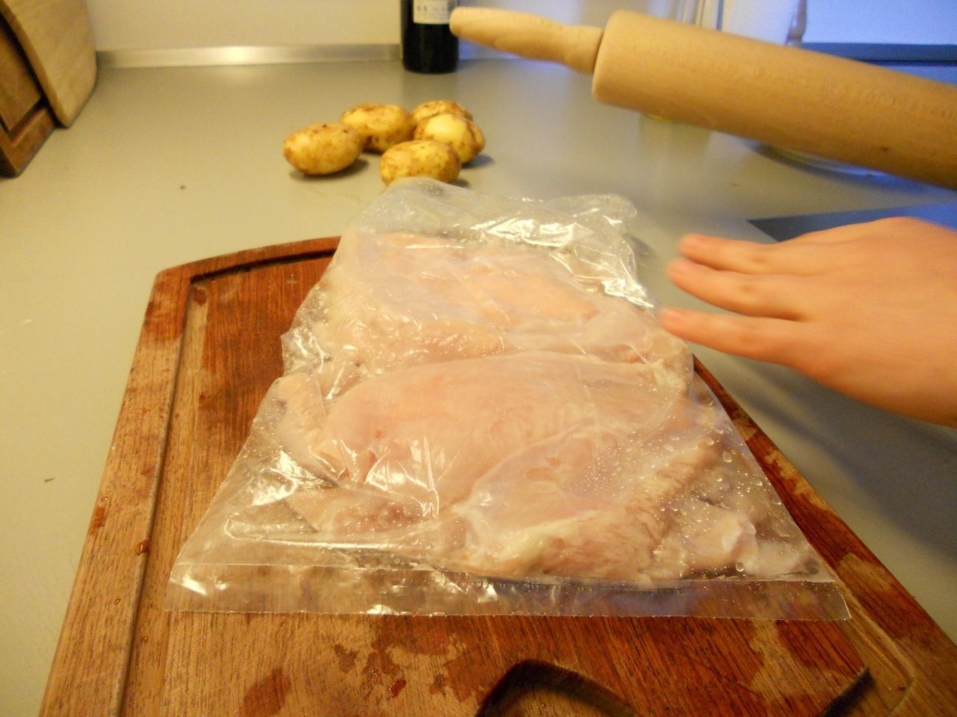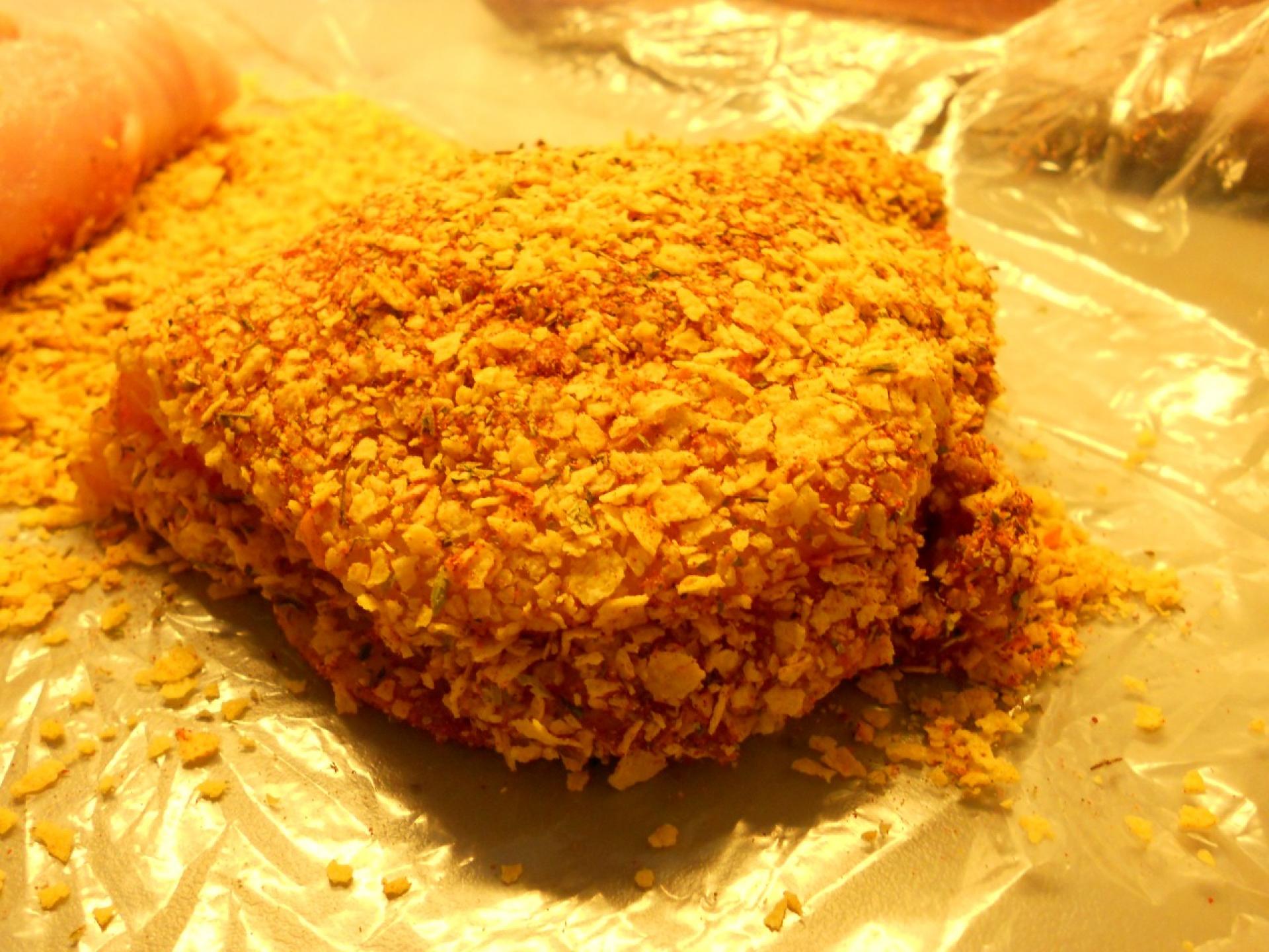 Rigeligt med cornflakes hældes i en pose sammen med krydderier efter smag samt salt og peber. Det hele knuses med en kagerulle og rystes så krydderierne fordeles jævnt. Herefter klippes posen op så der er plads til at vende kyllingerne i paneringen.
