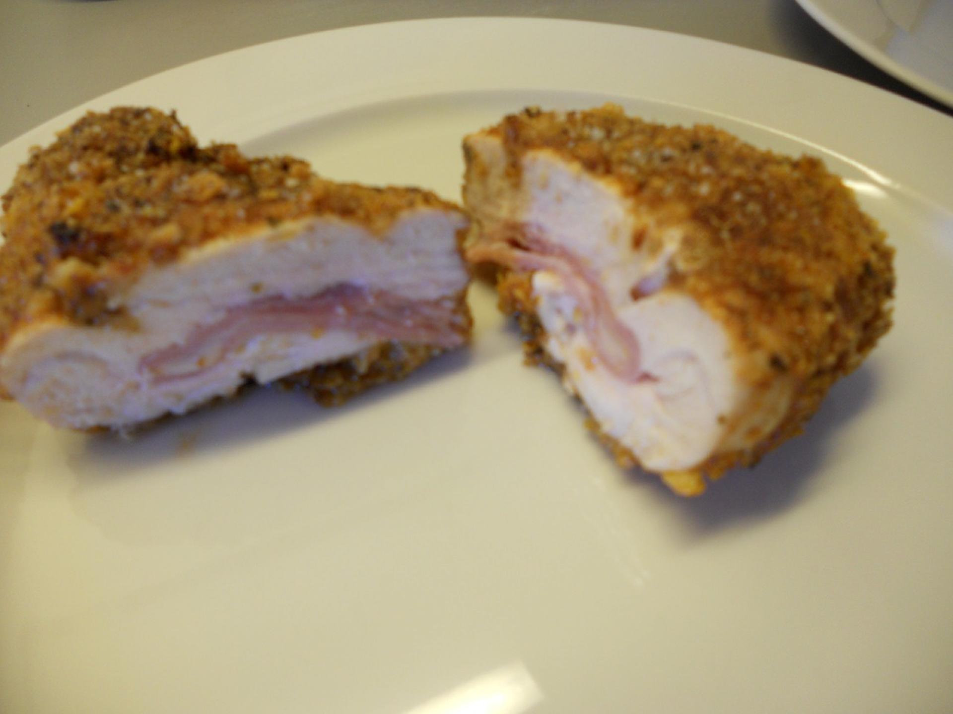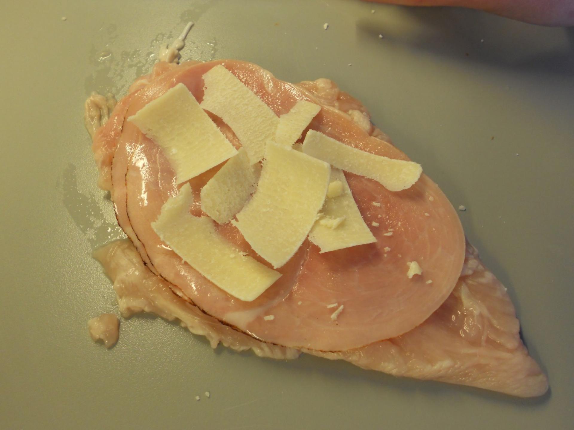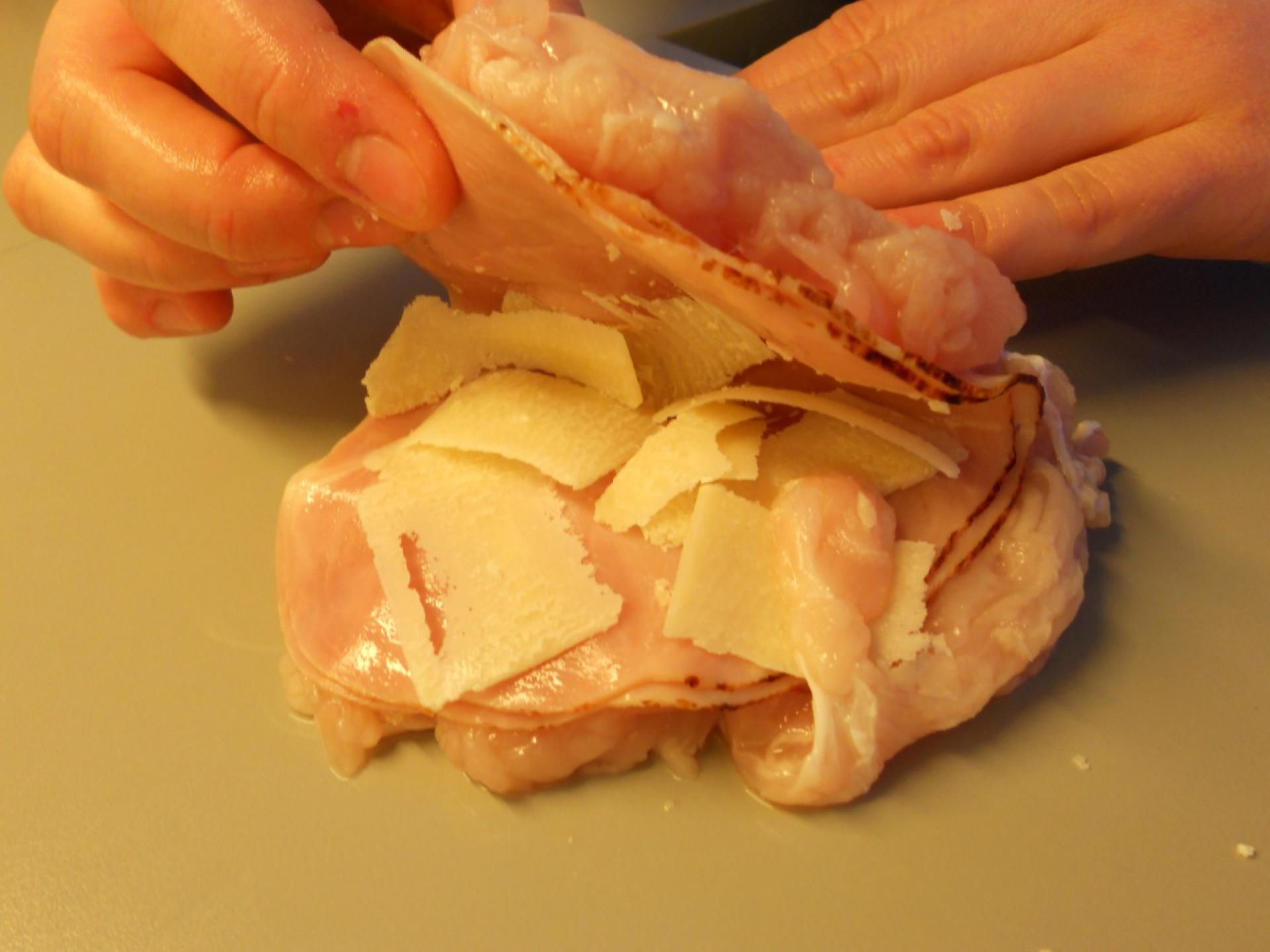 Skinke, efterfulgt af ost, placeres oven på den flade kylling...
