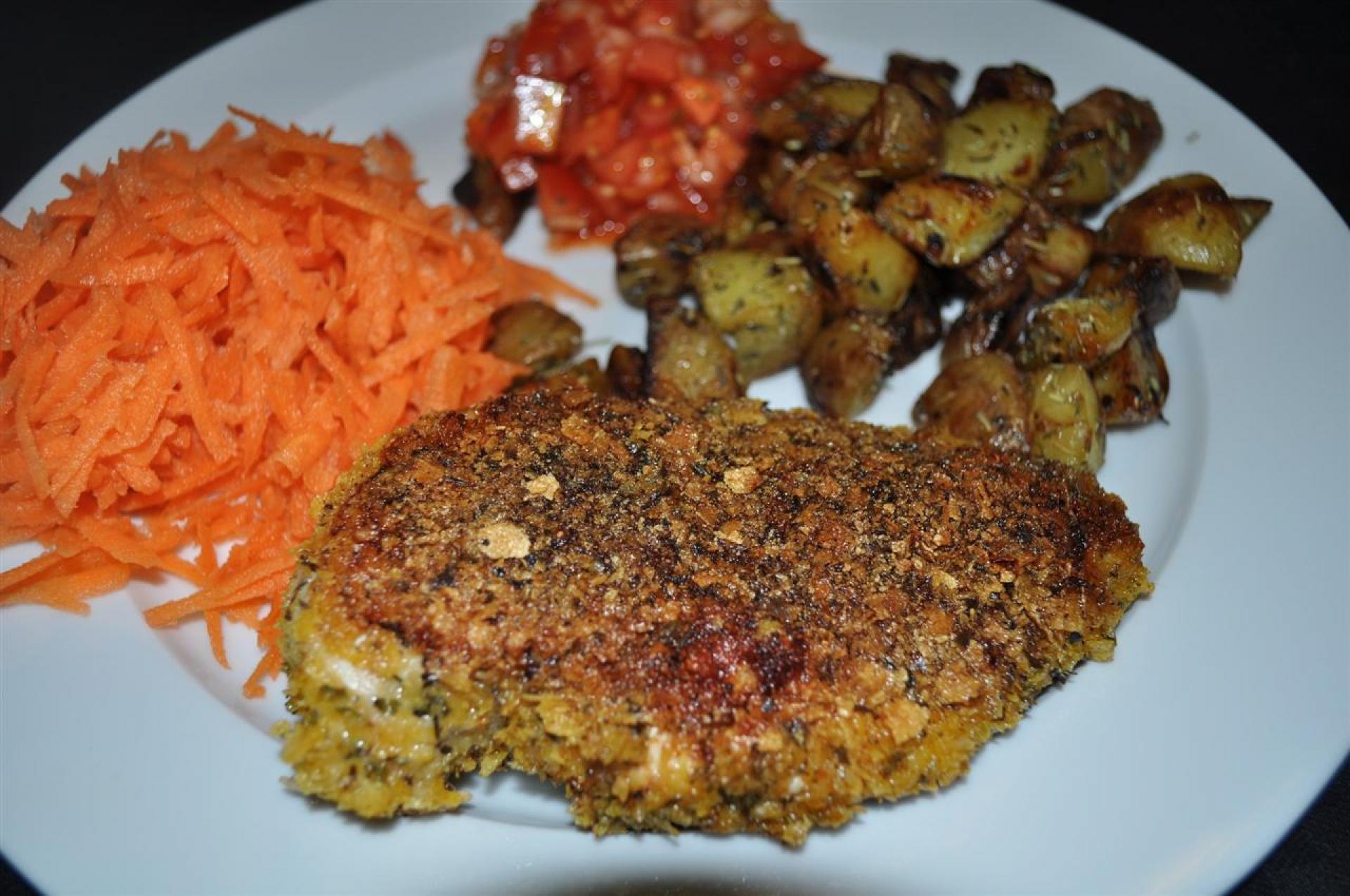 Brug alle dine aggressioner på cornflakesene så de blir knust fint. Til dette formål kan en kagerulle være til stor hjælp. I de knuste cornflakes tilsættes de krydderier man har lyst til, og kyllingbrystet vendes heri.