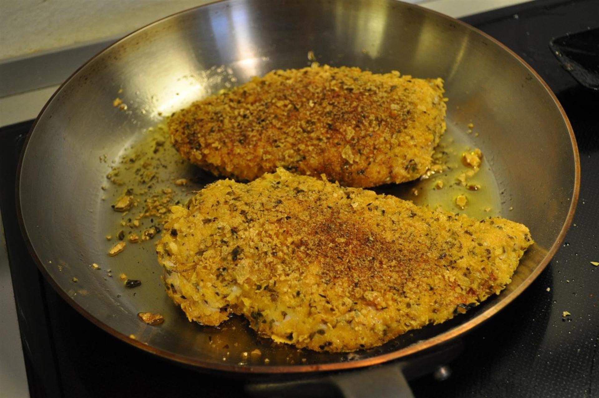 Lad herefter det panerede kyllingbryst hvile i 5-10 min. før det steges på en middelvarm pande til kernetemperaturen er oppe på 75°C.