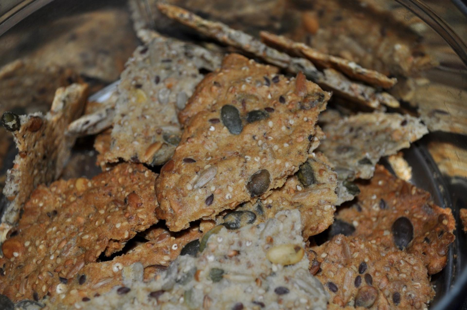 Bland det hele godt sammen. Fordel massen i et tyndt jævnt lag. Kan med fordel skæres før bagning. Bages på bagepapir ved 180°C i ca. 20 min.