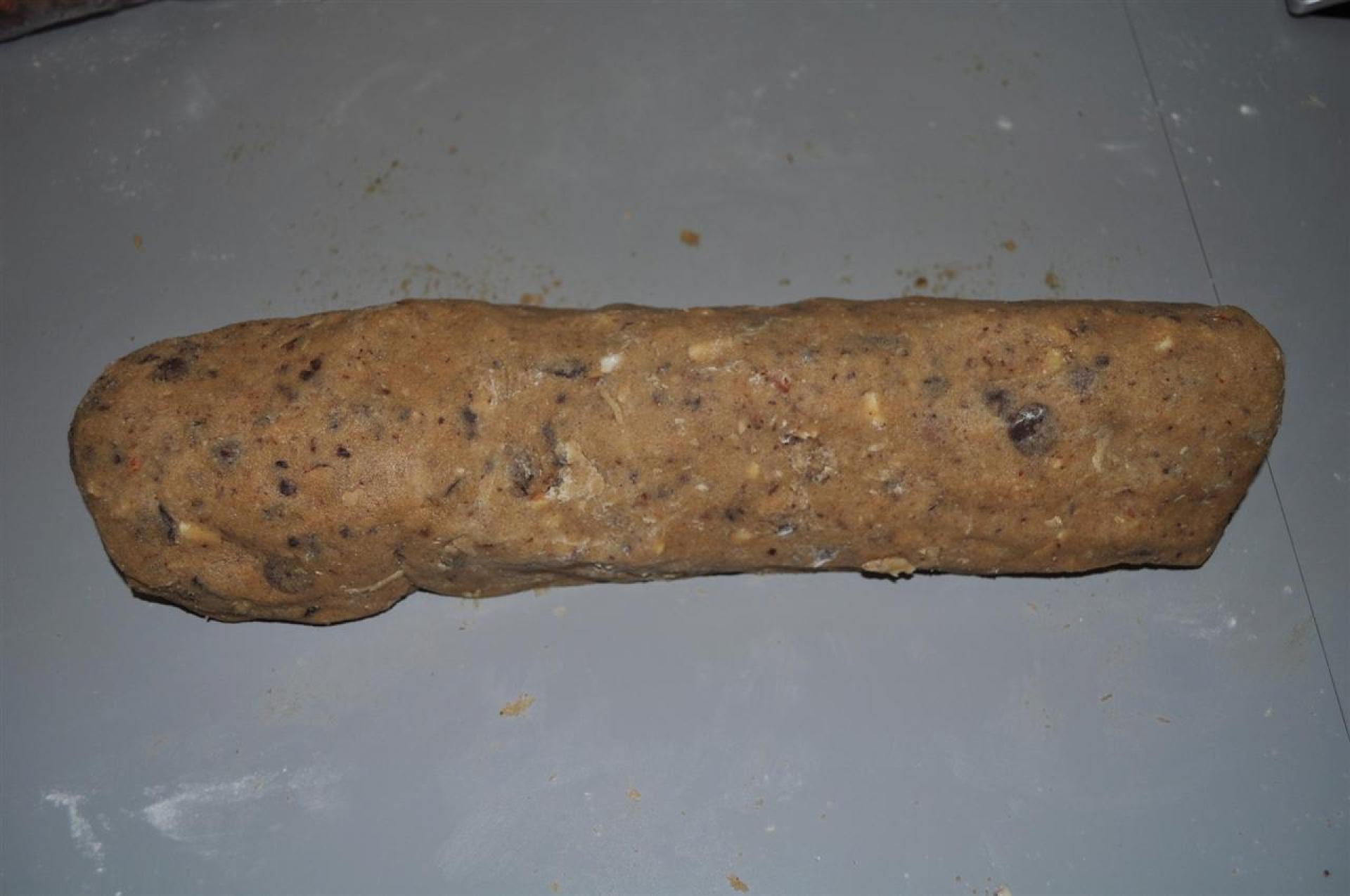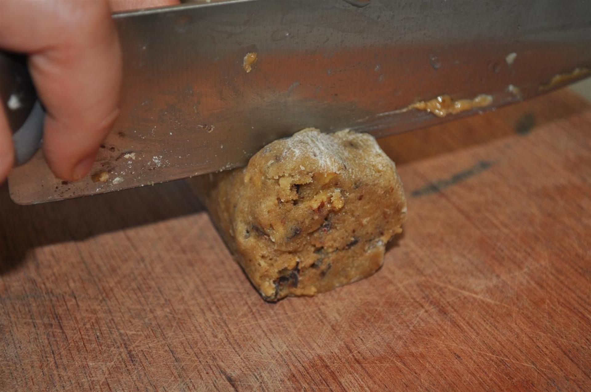 Herefter rulles dejen ud som pølser (De endelige cookies bliver ca. dobbelt så store som pølsernes diameter.), og sættes på køl en times tid så smørret størkner igen og dejen blir lettere at skære ud.