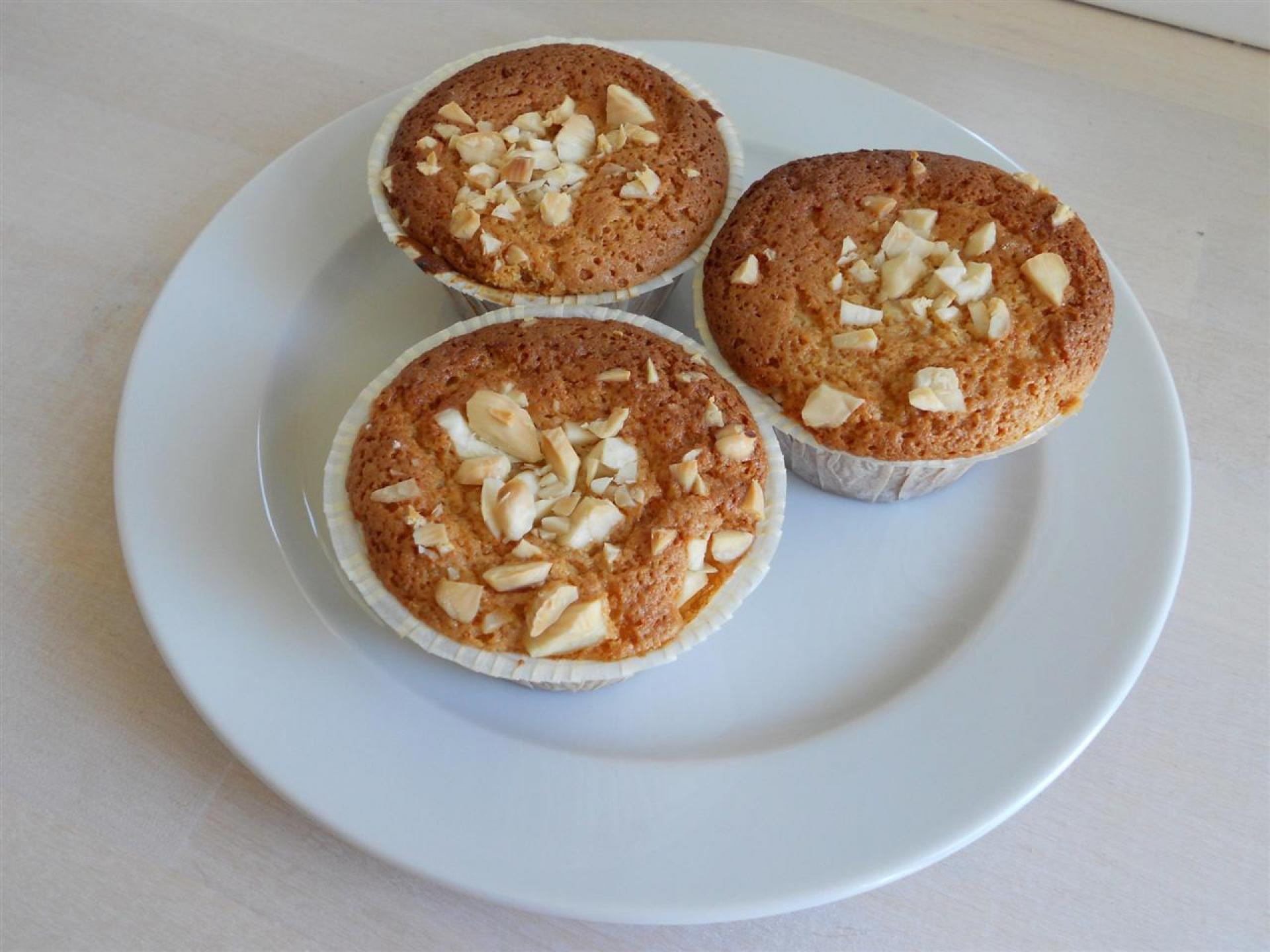 De hakkede mandler drysses over og muffinsene bages i ca. 10-15 min.