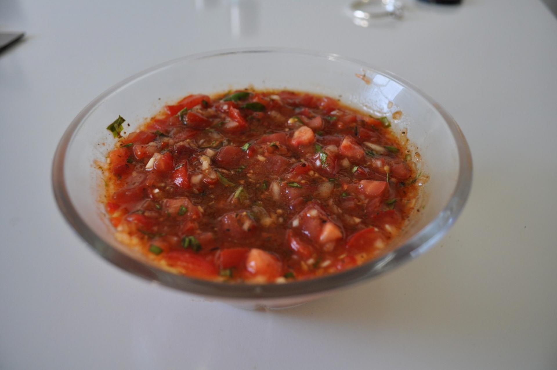 Tomaterne hakkes fint og blandes sammen med løg og hvidløg der hakkes meget fint.