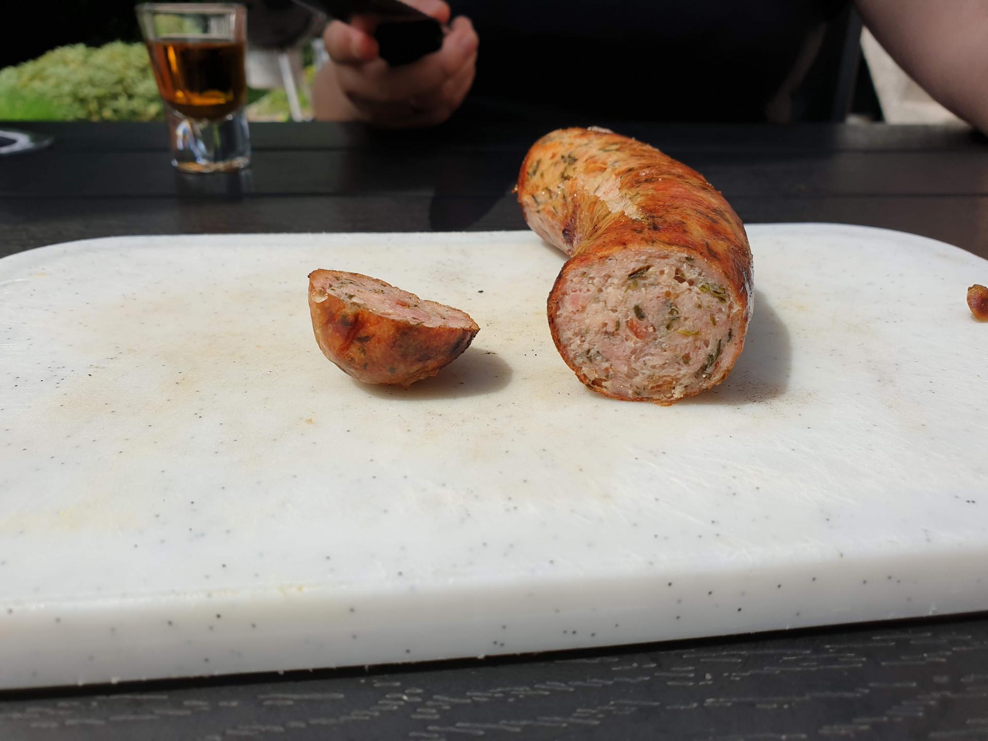 Når pølserne er drejet, blancheres de i 70°C varmt vand i 15 minutter...