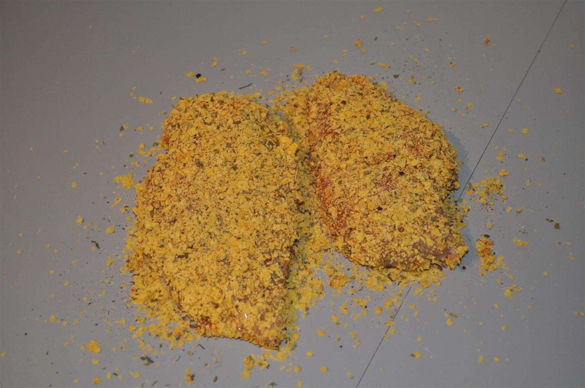 Brug alle dine aggressioner på cornflakesene så de blir knust fint. Til dette formål kan en kagerulle være til stor hjælp. I de knuste cornflakes tilsættes de krydderier man har lyst til, og kyllingbrystet vendes heri.