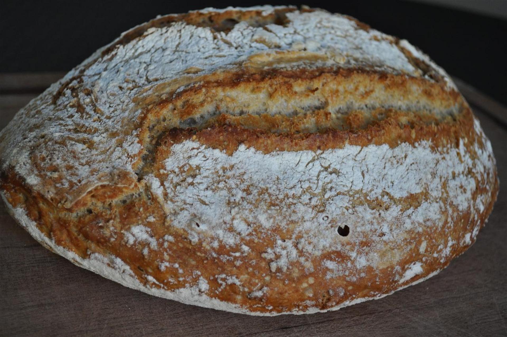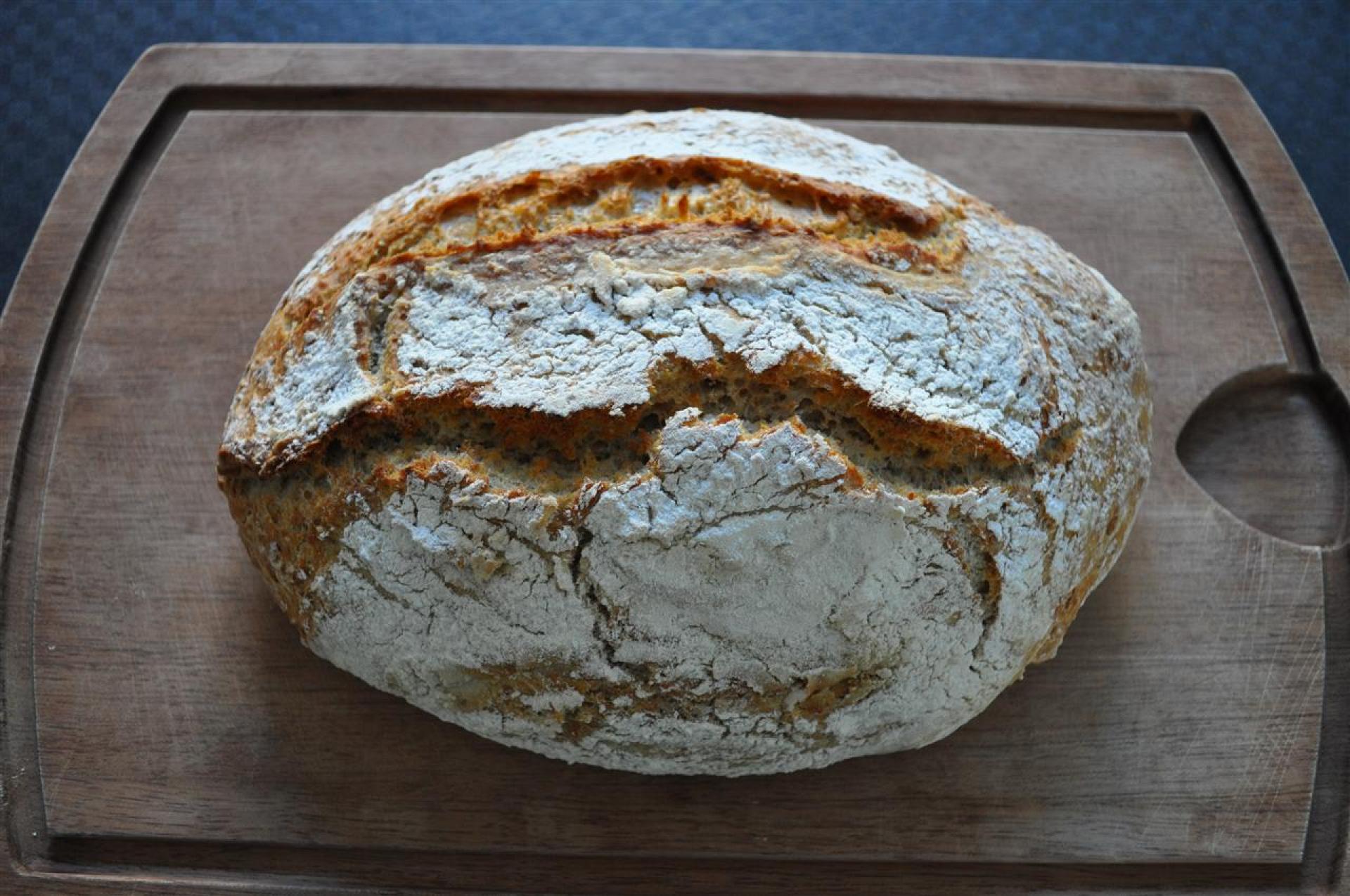 Når ovnen er varm nok drysses gryden med mel og dejen kommes i, og drysses med mel. Gryden sættes ind i ovnen med låg i 20 min på 250°C.