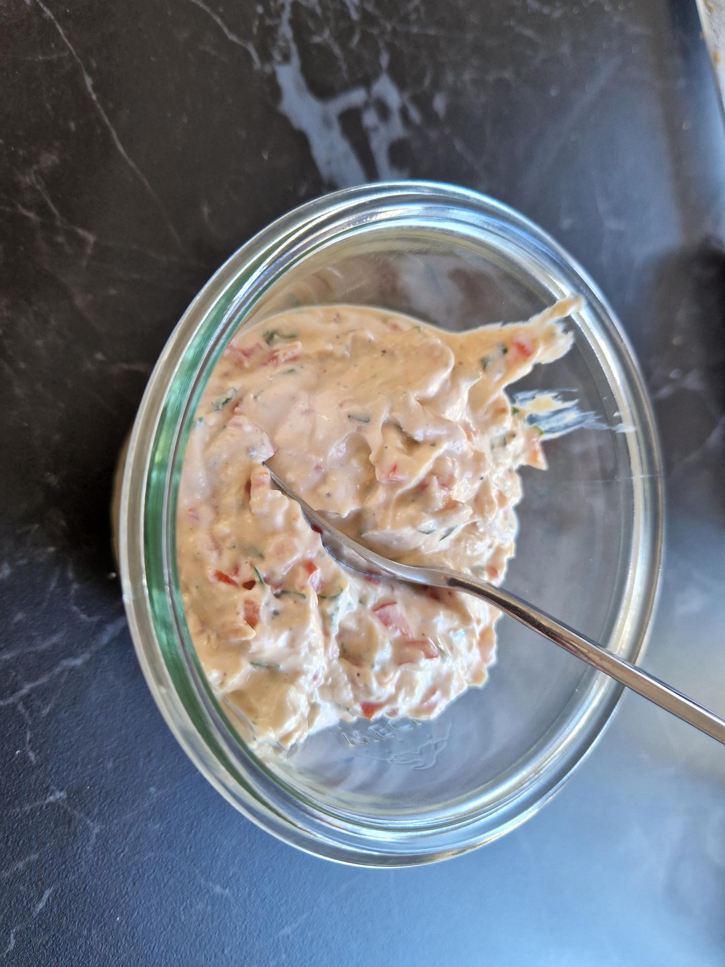 Fetaen moses med en gaffel. Peberfrugten og tomaterne skæres i meget små tern. Hvidløg presses og persillen hakkes. Det hele blandes sammen og smages til med chilisovs, citronsaft, salt og peber.