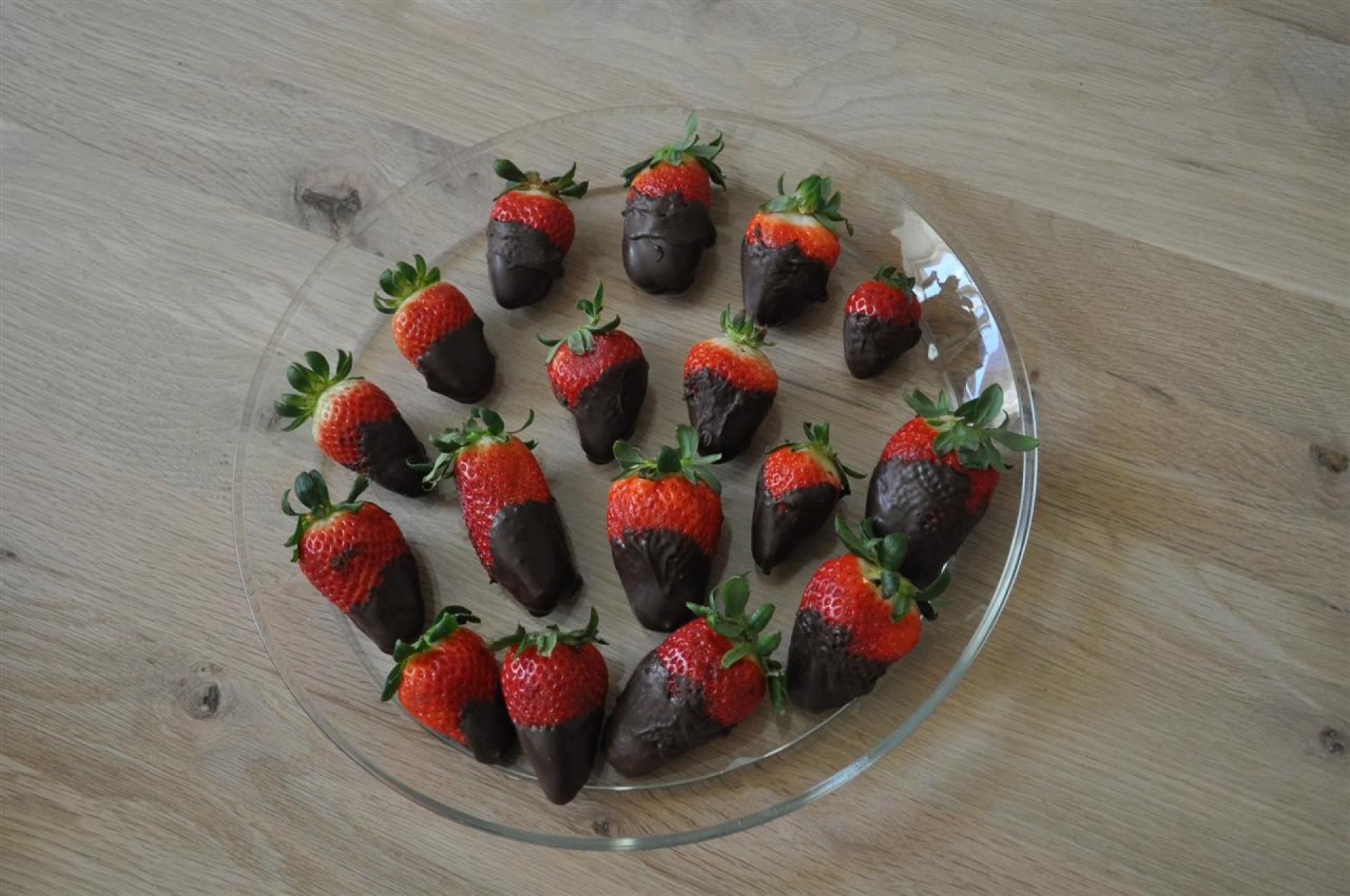Smelt chokolade over et vandbad. Dyp spidsen af jordbærene i chokolade og læg dem på en plastikpose for at størkne.