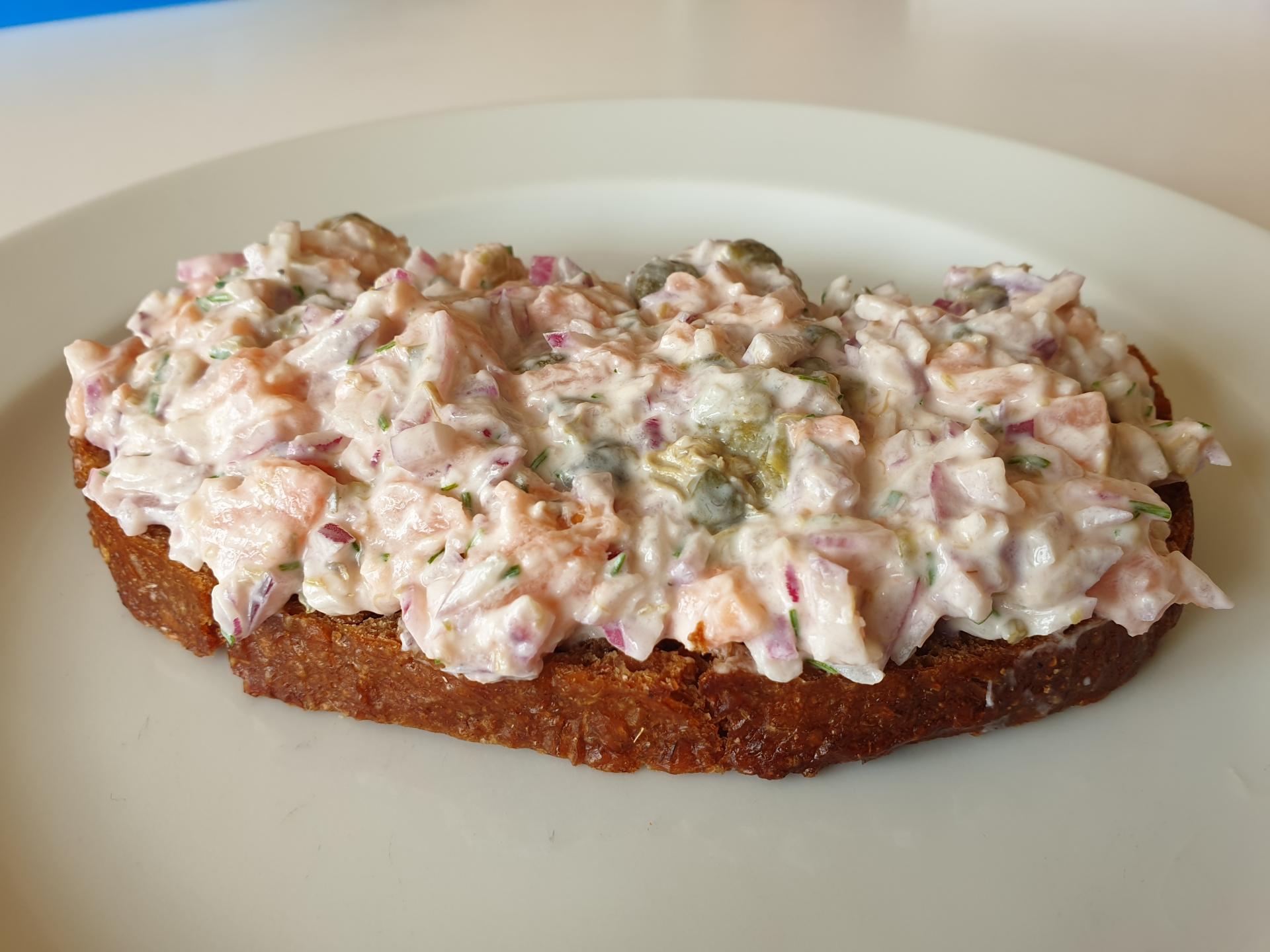 Det røgede laks skæres i små tern. (Jeg bruger ofte røgede lakserester, da det er billigere og stykkerne ofte er lidt tykkere)