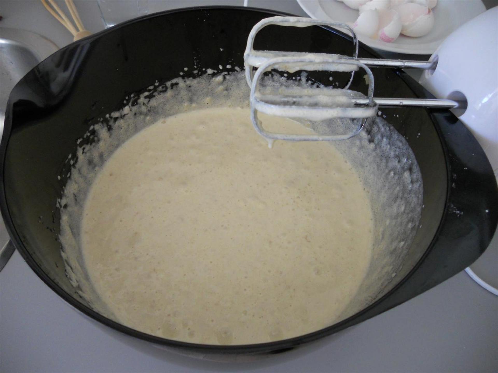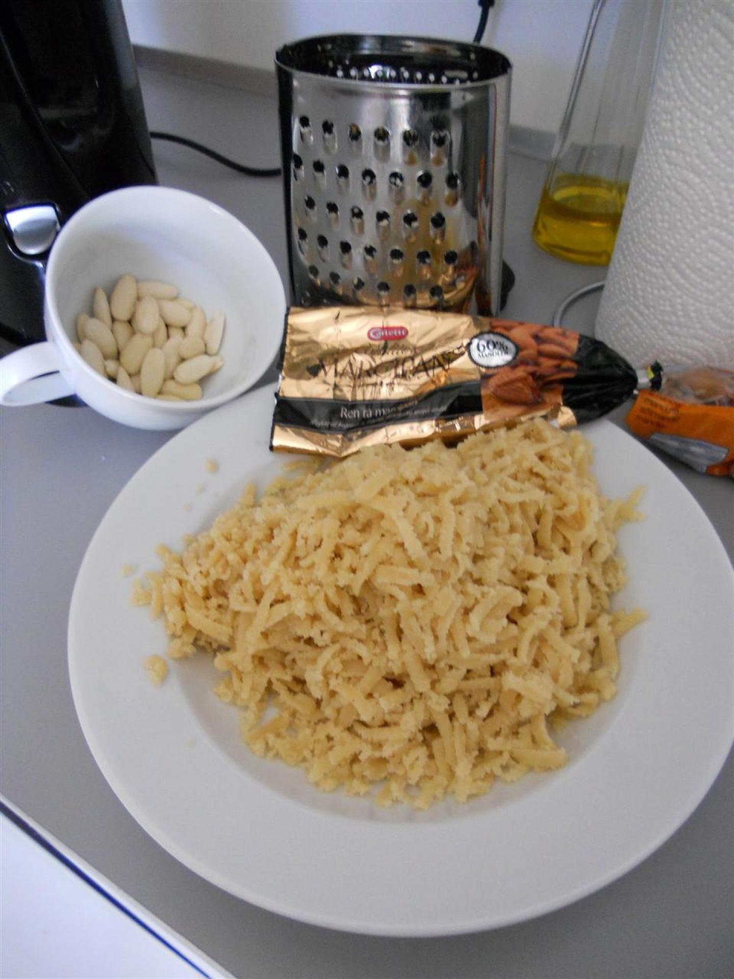 Smelt smørret. Marcipan, æg og sukker piskes sammen med en håndmixer til det er hvidt og skummende.