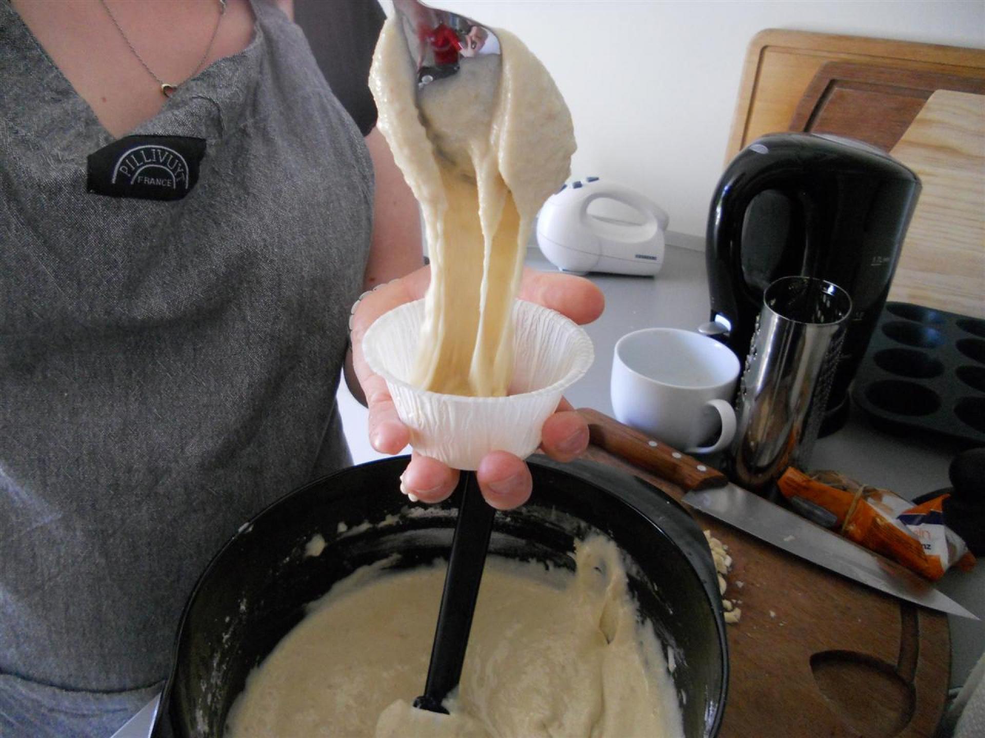 Herefter piskes det smeltede smør gradvist i. Vend mel og bagepulver i massen med en dejskraber. Smør formene og held dejen i så formene er ca. 2/3 fyldte.