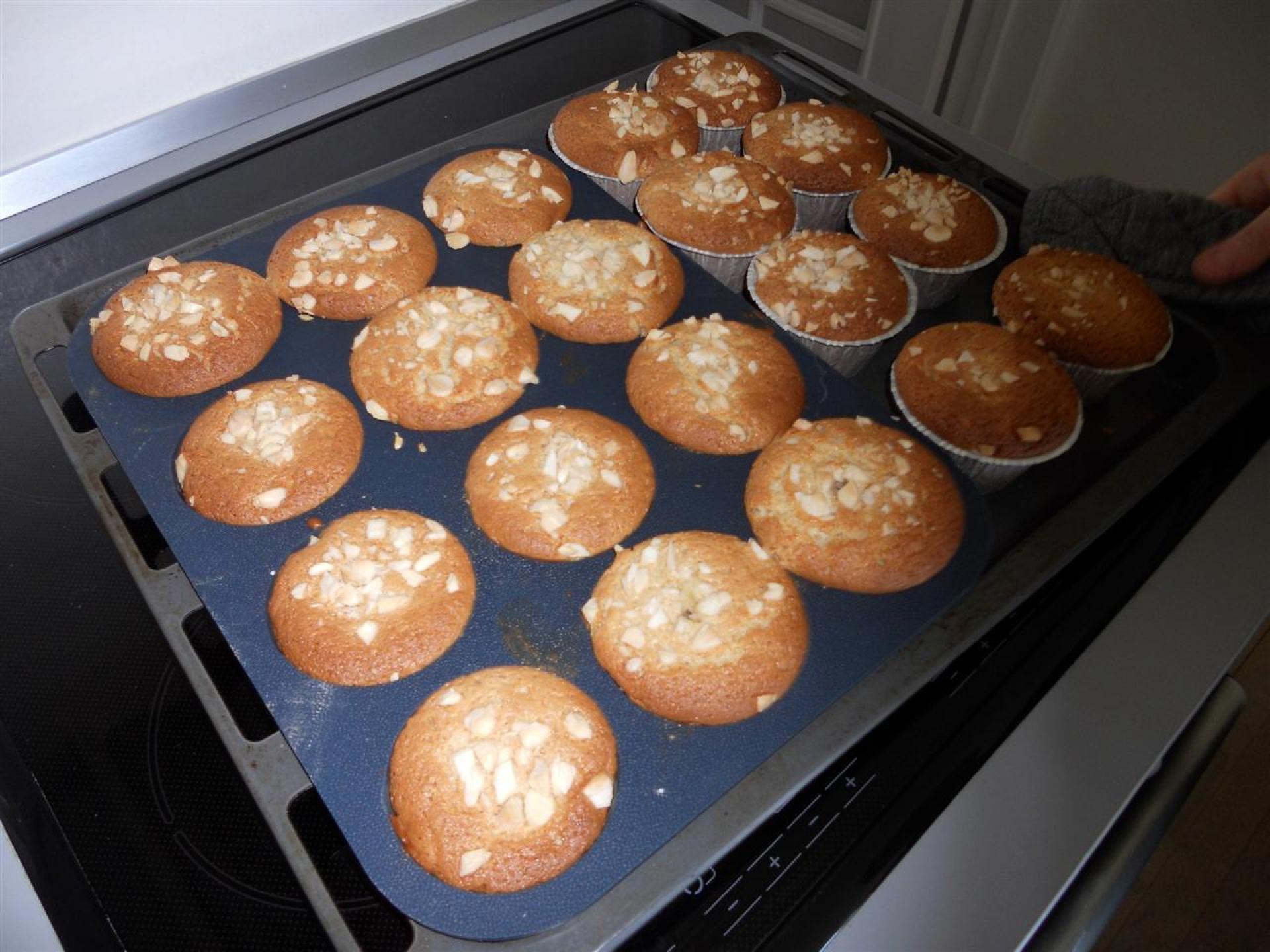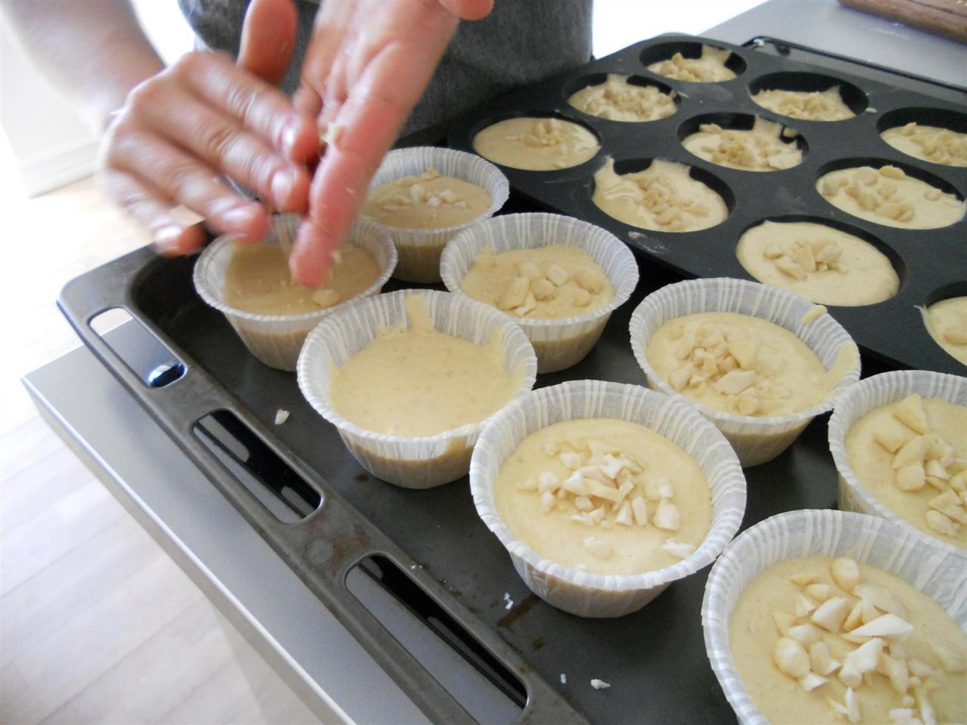 De hakkede mandler drysses over og muffinsene bages i ca. 10-15 min.