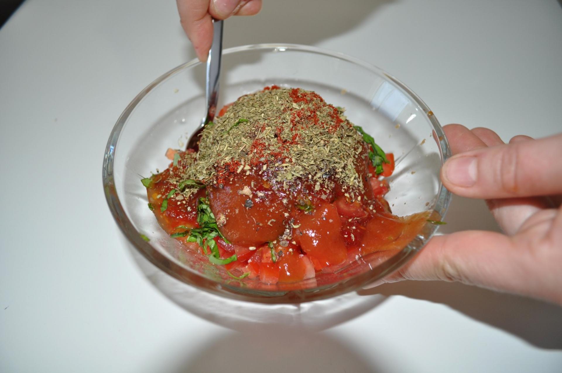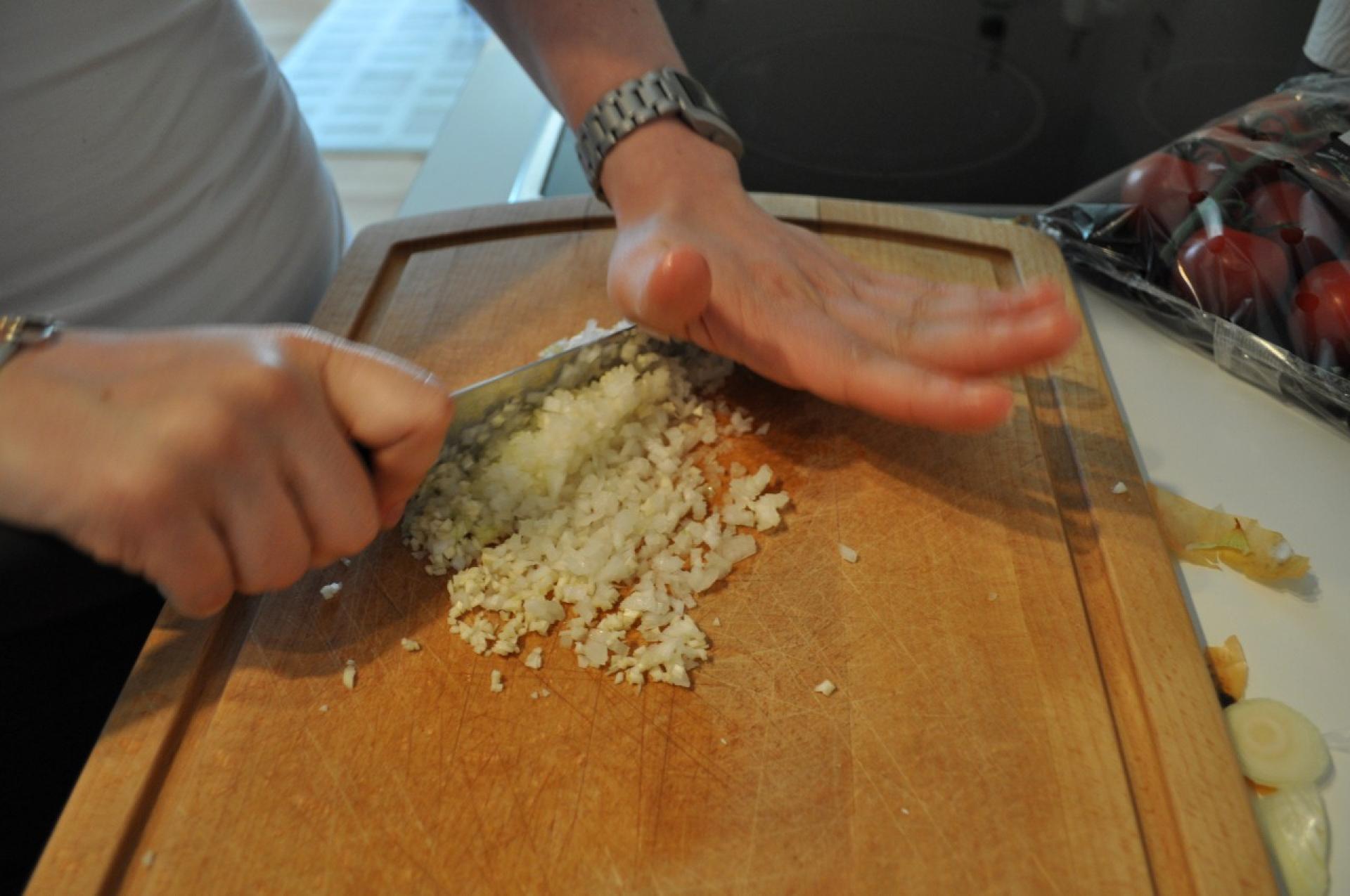 Tomaterne hakkes fint og blandes sammen med løg og hvidløg der hakkes meget fint.